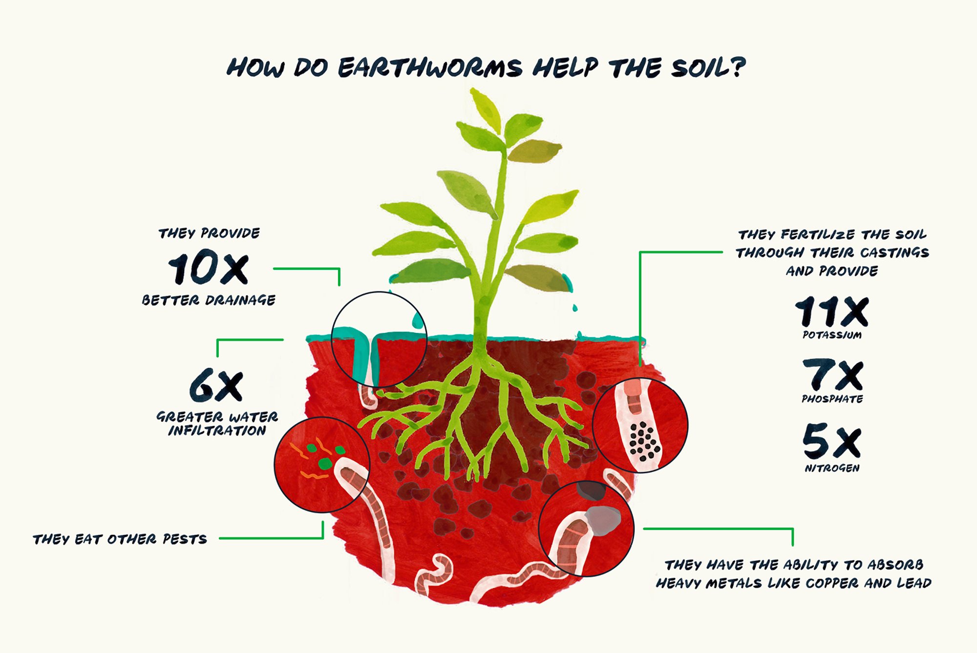 As earthworms meander and munch their way through the earth they aerate the soil, relieve compaction, move microorganisms around and the chemistry of their guts renders soil and plant matter into fertile humus, while boosting microbial life and aiding plant root formation.