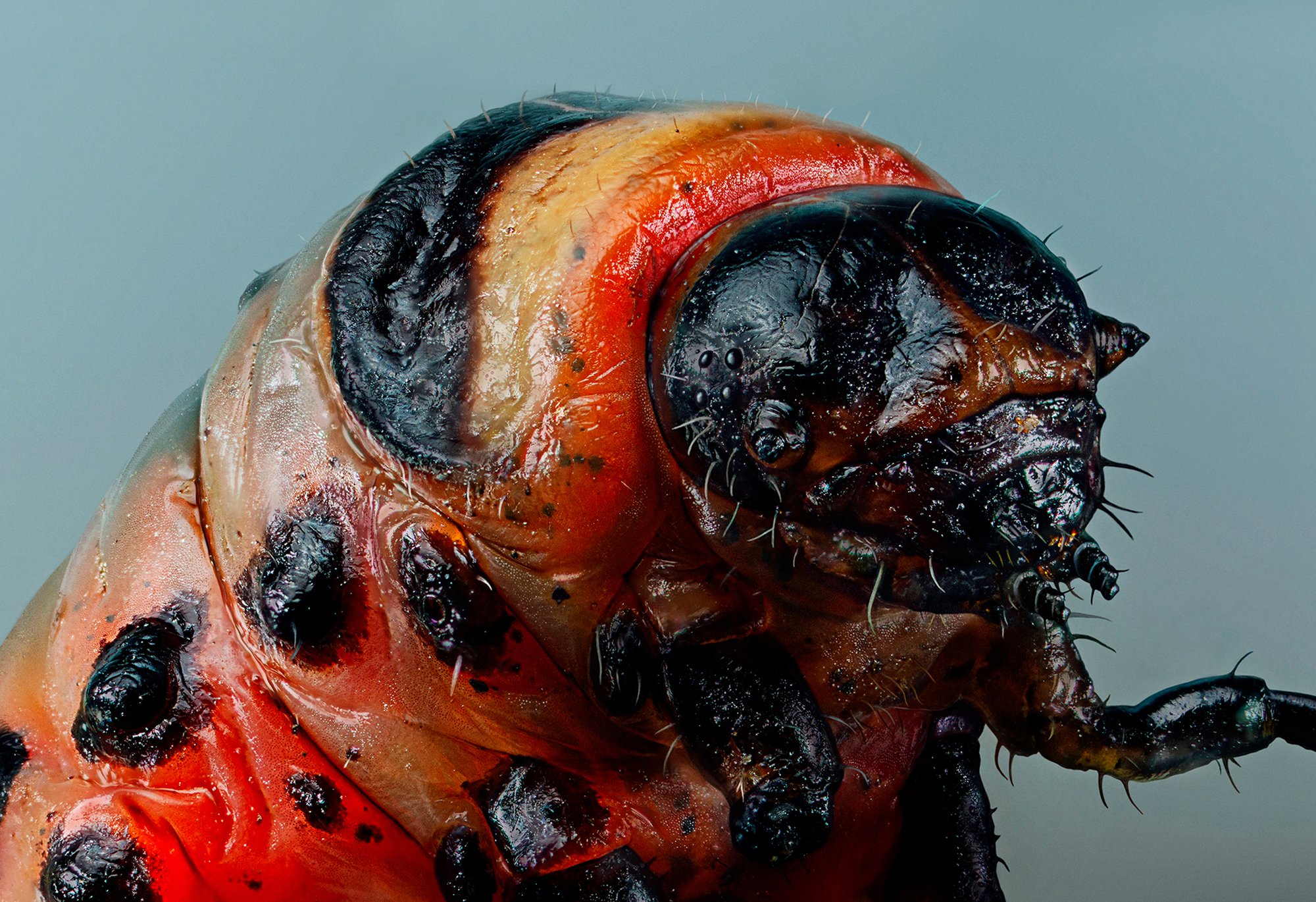 Colorado potato beetle larvae on a leaf (Leptinotarsa decemlineata). Irina Petrova Adamatzky specializes in wildlife micro-photography and science fiction inspired installations organically integrating living and artificial entities.