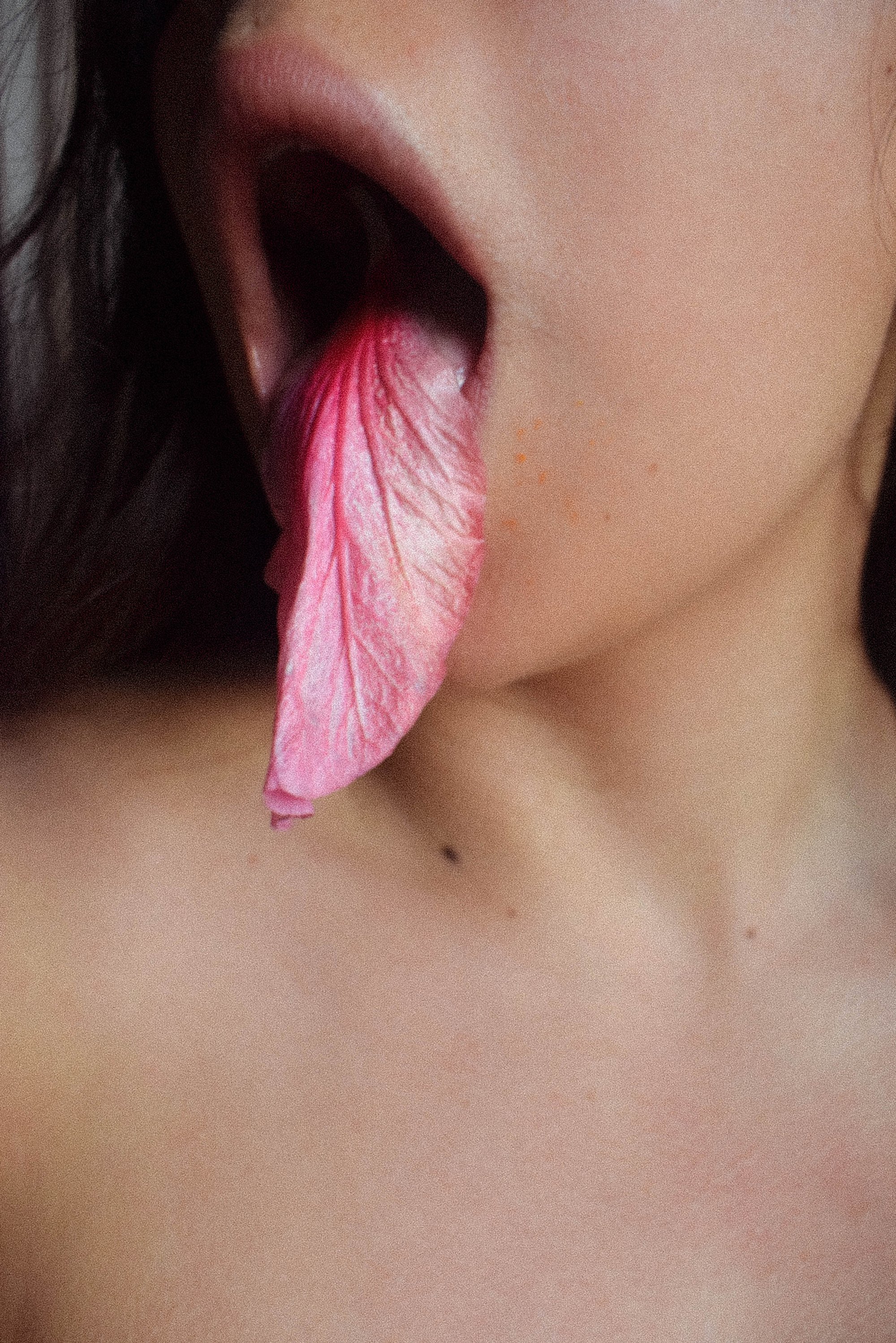 La Sangre playfully places a Hibiscus petal in her mouth, looking like a tongue. She writes that the image is “Self-portrait and magic ritual to empower my voice.”