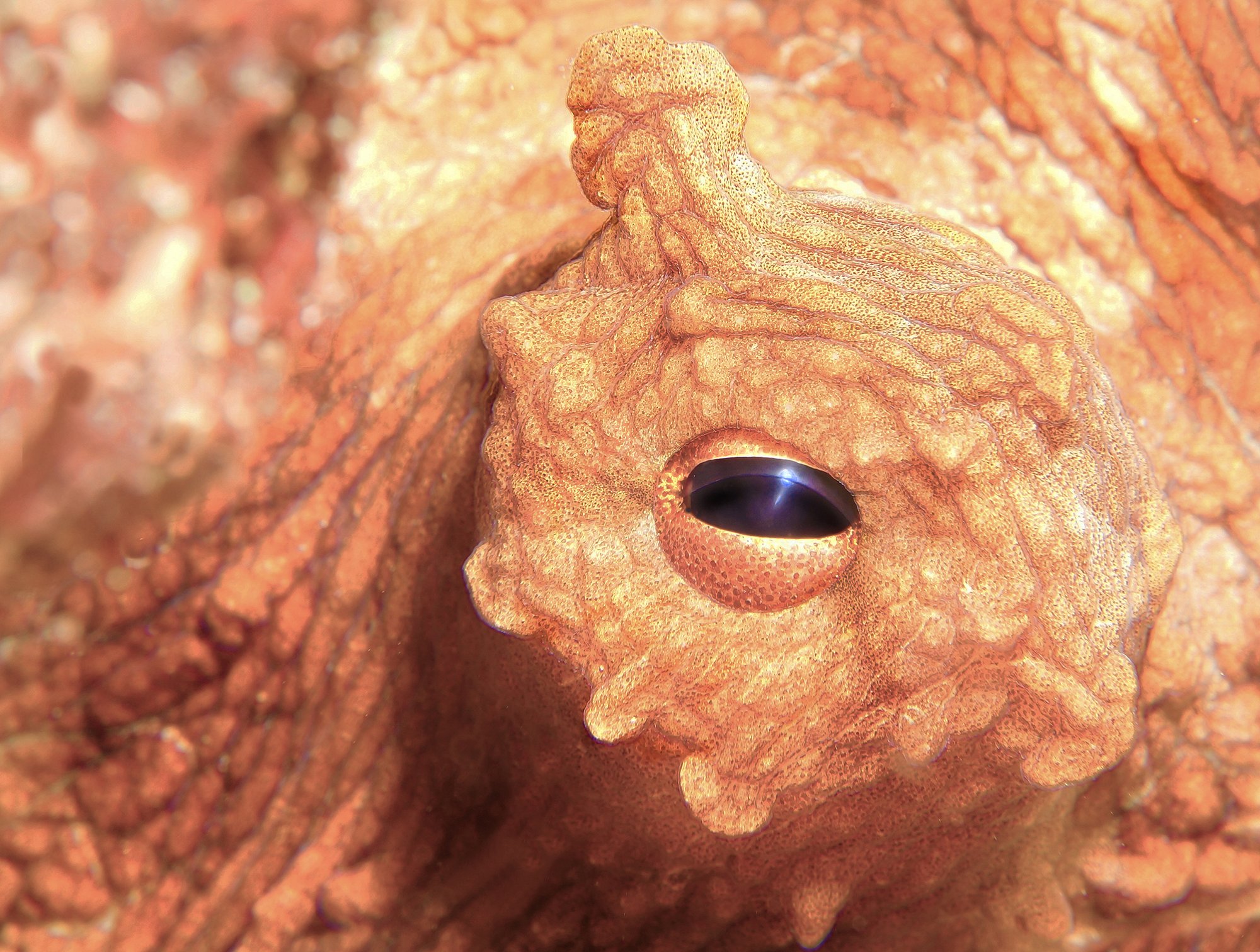 Caribbean Reef Octopus (Octopus briareus). Octopi are often elusive to photograph during the day. This one surprised the artist by remaining in sight at the back of its lair while the camera did its job.