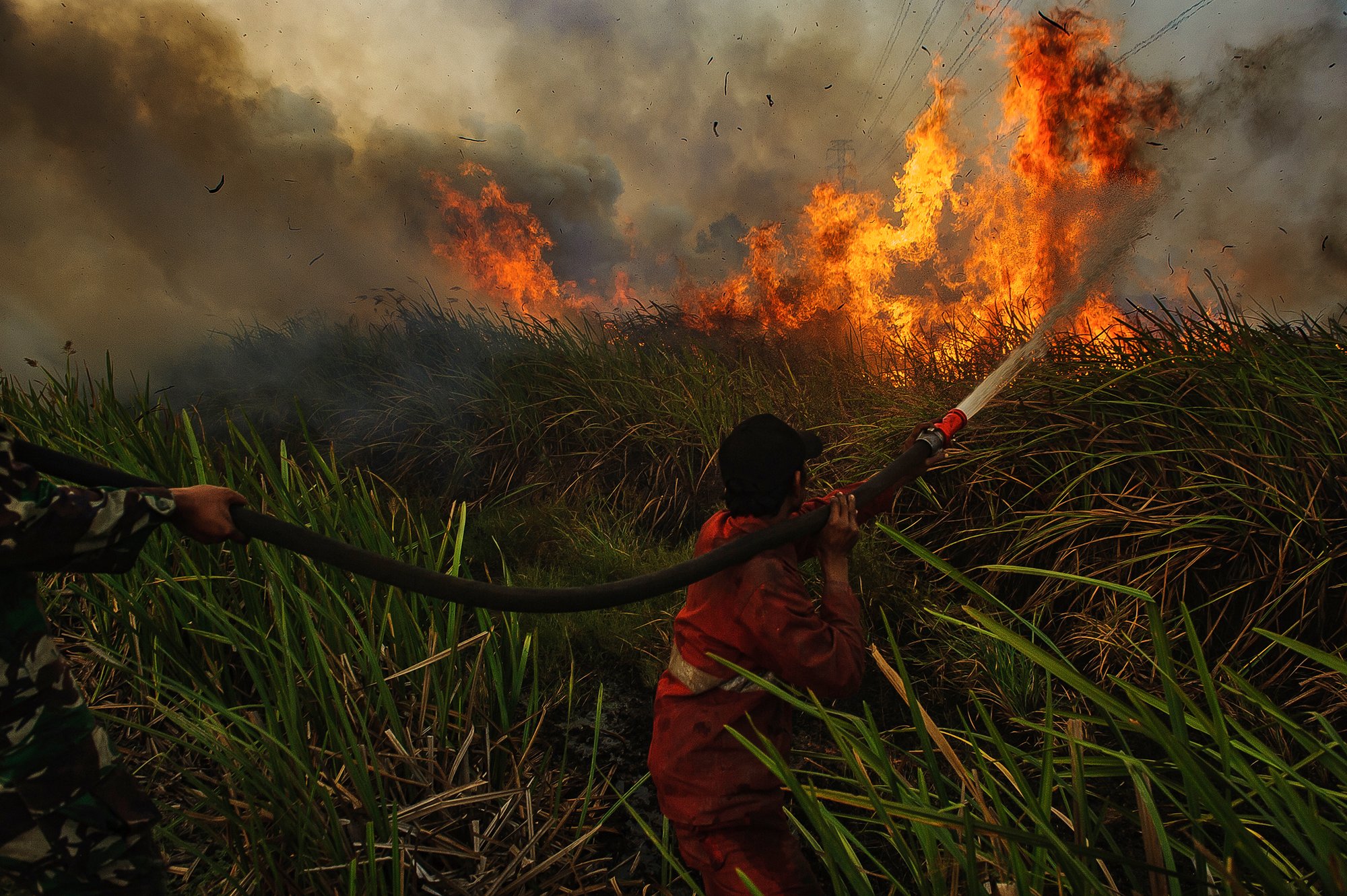 Manggala Agni and military personnel were seen extinguishing the fire hotspot from peatland fires which are plantation areas in Ogan Komering Ilir, Palembang, Sumatra island, Indonesia. Photo taken on August 23, 2019. El-Nino storms due to global warming have triggered the occurrence of catastrophic fires in peat land and forest areas on the Sumatra Island, Indonesia from 2014-2019.