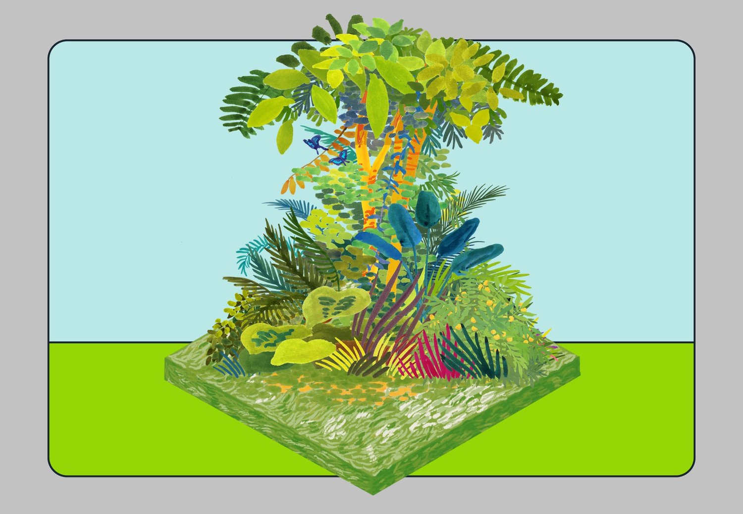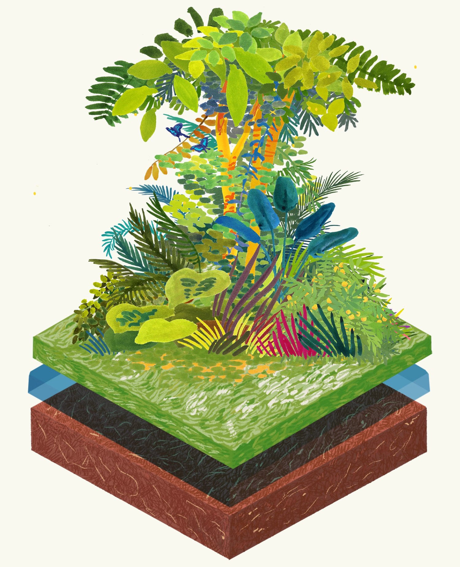 Urban forests planted using the Miyawaki Method are made up of multiple layers of varying heights. This mixture of shrub, sub-tree, tree and canopy tree creates a green wall that slows down the force of destructive flooding.