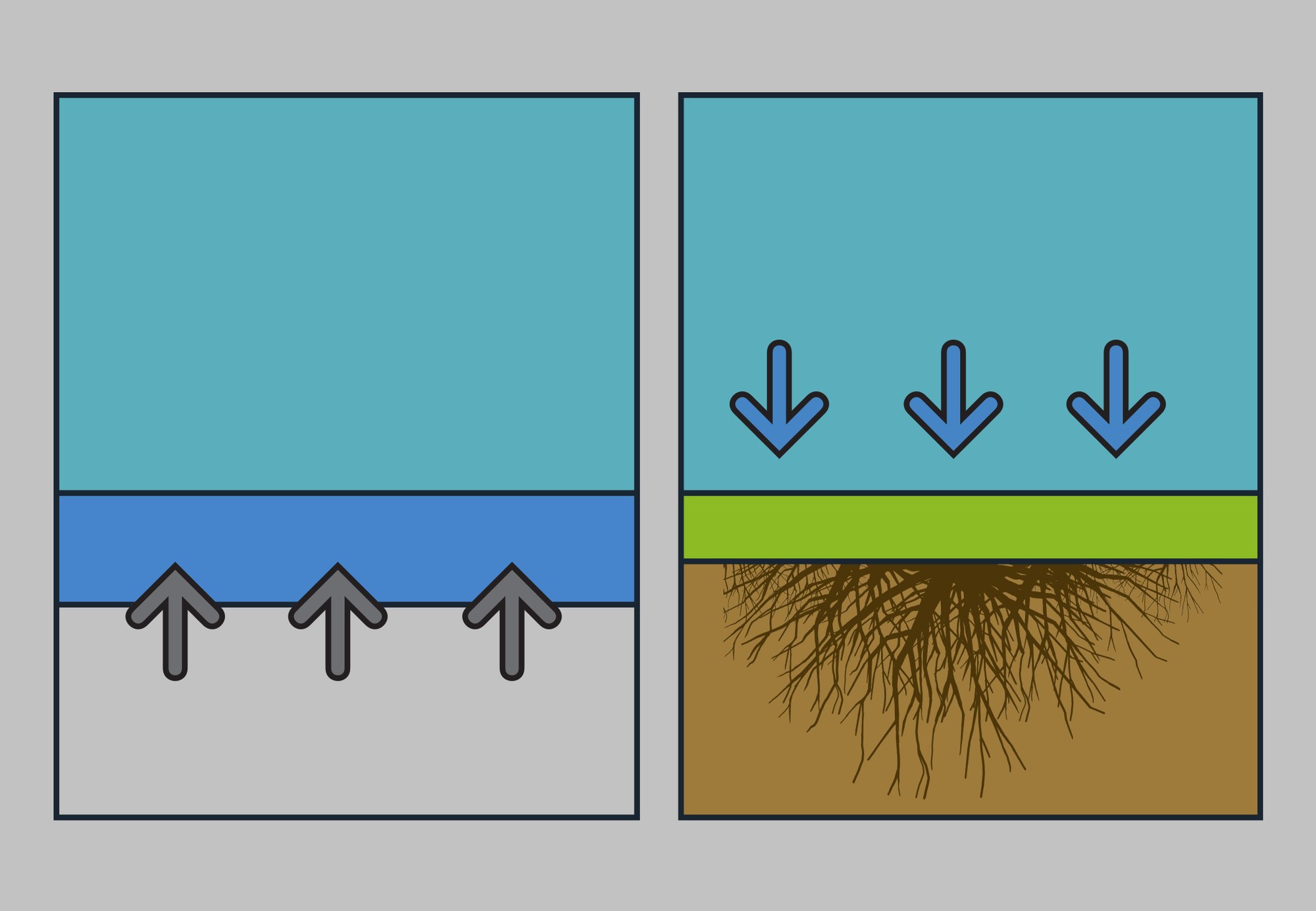 Today, concrete outweighs the carbon mass of every tree, bush and shrub on this planet. The rapid greyification of our cities is causing them to be hit extra hard by the climate crisis. The Urban Heat Island Effect already makes urban areas up to 12°c hotter than surrounding rural areas, and the UHI intensifies as natural land is replaced by non-vegetated areas. The rise in impervious surfaces is also causing increased surface water runoff and more flash floods.