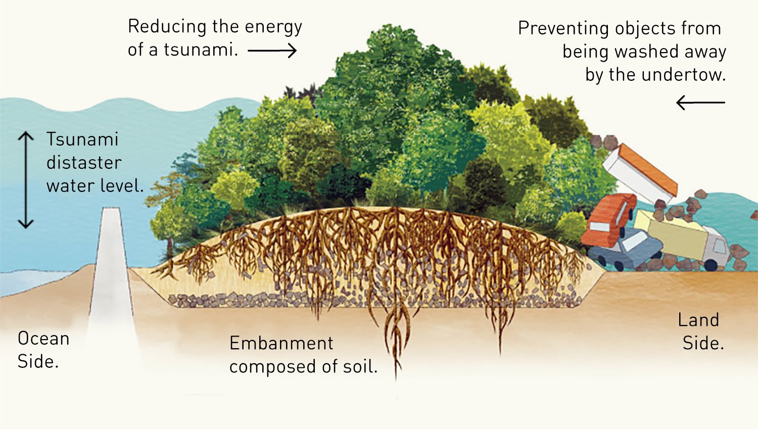 We can use these forests to reduce the energy of extreme weather events like tsunamis and hurricanes. Deep roots prevent the trees from falling over, and the blockade of branches prevents drifting debris such as cars from being washed away by the undertow.