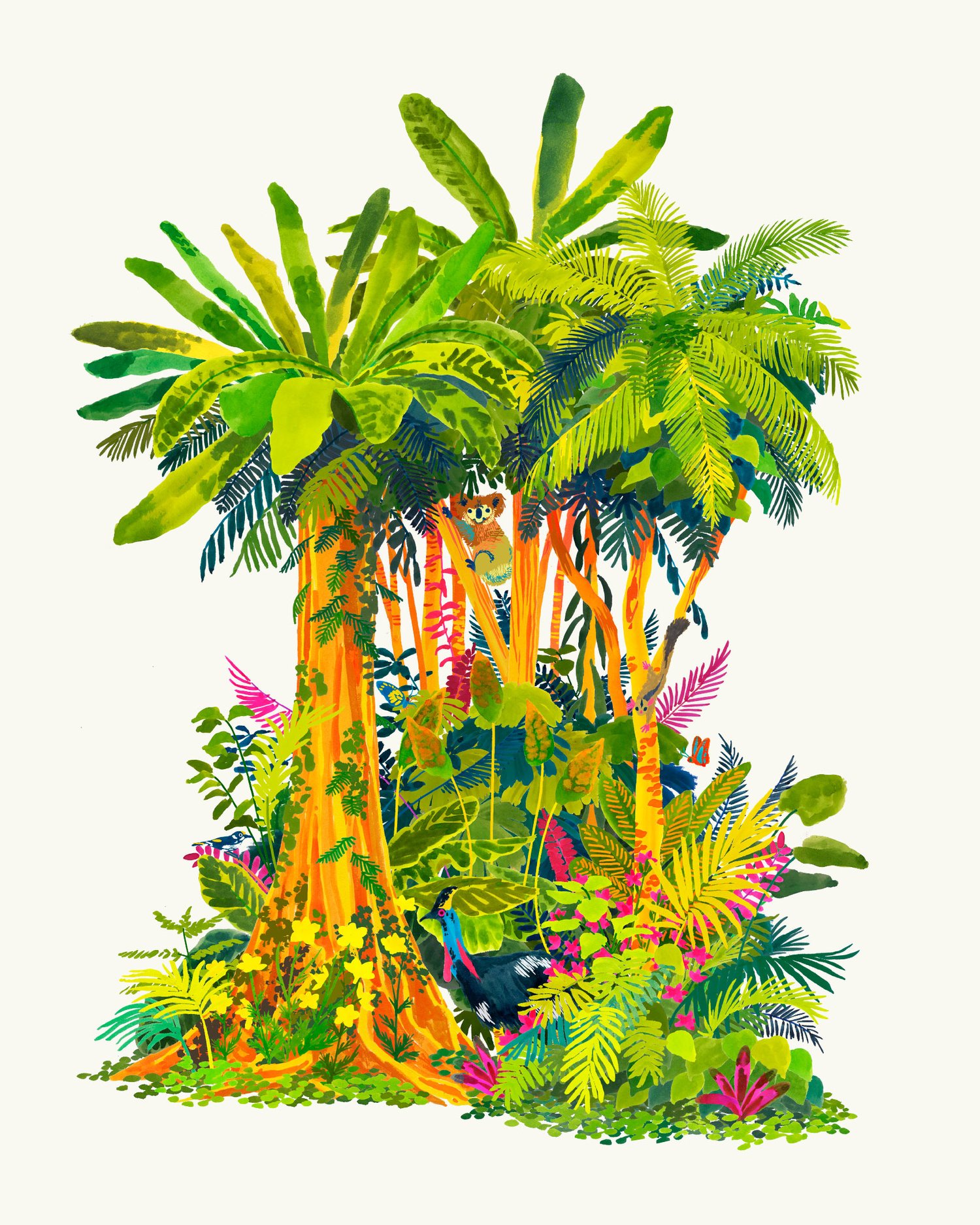 But biodiversity isn’t only essential in the soil and on the forest floor; a rich mixture of life is also needed in the canopy. Pollinating birds, bats and insects enable plants and trees to breed, create seeds and pass on their genetic material. Birds and mammals enable the dispersal of plant and tree seeds, gorging on fruits and nuts, and predators maintain the balance of the food chain, managing pests by eating invertebrates that may decimate tree populations. Plants create oxygen, clean air, water, food, shelter and medicine, enabling all animals to survive.