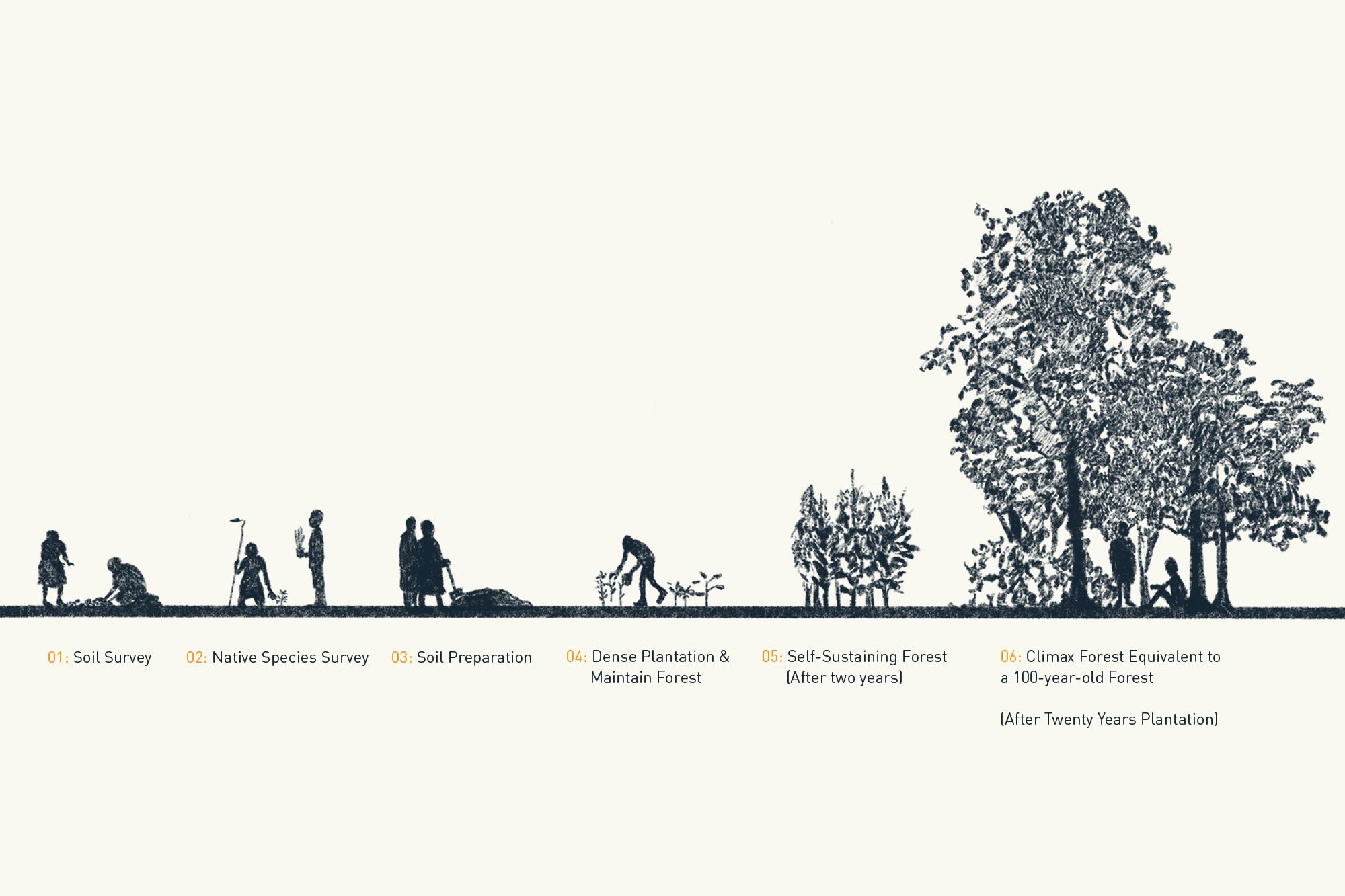 His 40 years of research has developed into the ‘Miyawaki method’ — an approach that prioritizes the natural development of forests using native species. Miyawaki forests can grow into mature, self-sustaining ecosystems in a short span of time. They act as an oasis for biodiversity, heal the environment in many direct ways and reconnect the local community to nature and the potential for natural healing.