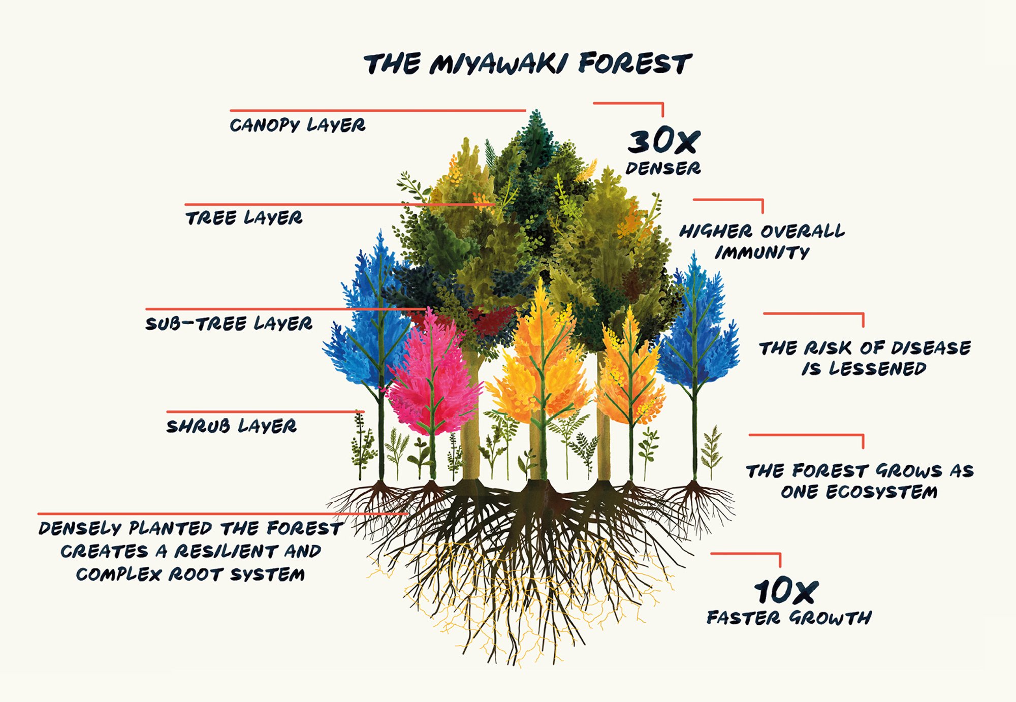 Initial density of sapling planting is a key method of the Miyawaki method .