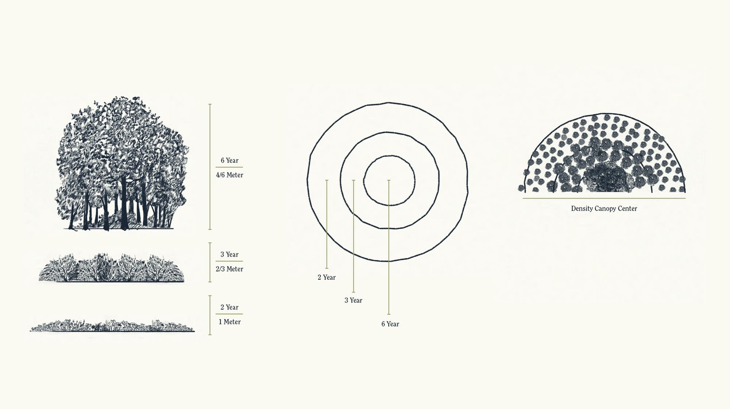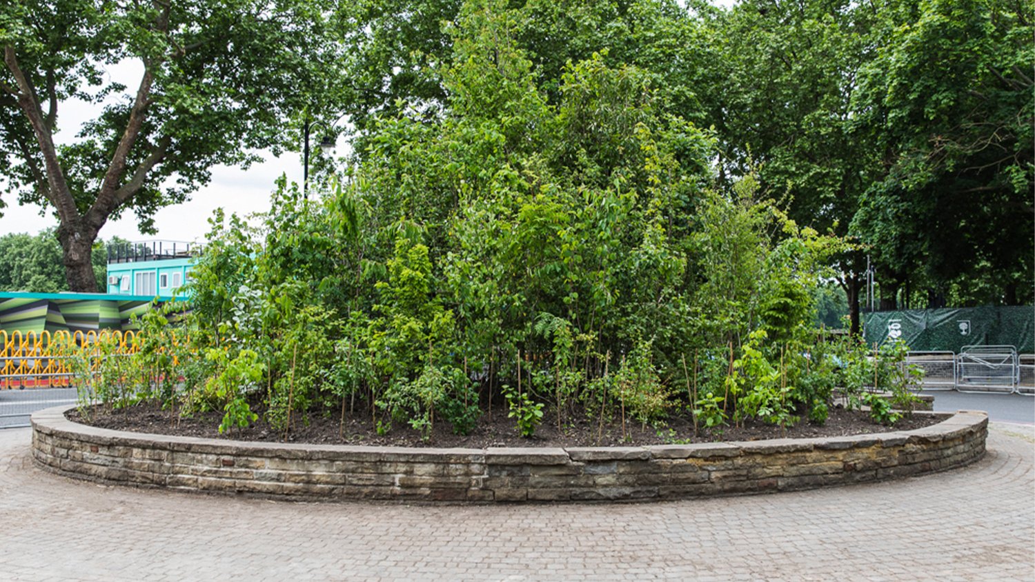 In the Spring of 2022, our collective journey to ‘rewild’ Chelsea continued with an ambitious two-phase project known as the “Serenity Forest.” Phase 1 creates a native pocket forest at the entrance to RHS Chelsea Flower Show. Sited on the iconic roundabout just outside the Bullring Gate, the installation illustrates how minimal urban space can create maximal biodiversity, reintroduce indigenous species, and reconnect people with nature in our cities. The three growth stages of a ‘Miyawaki’ forest not only mimics the density of an ancient forest, but creates a crown-like structure in celebration of HRH Queen Elizabeth II’s Platinum Jubilee.