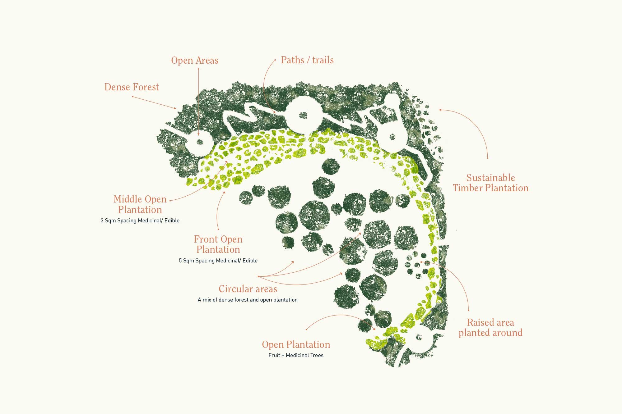 Peaceful meditative areas, buildings and art installations will blend into the forest to allow immersion and deepening of the abiding connection between people and nature.
