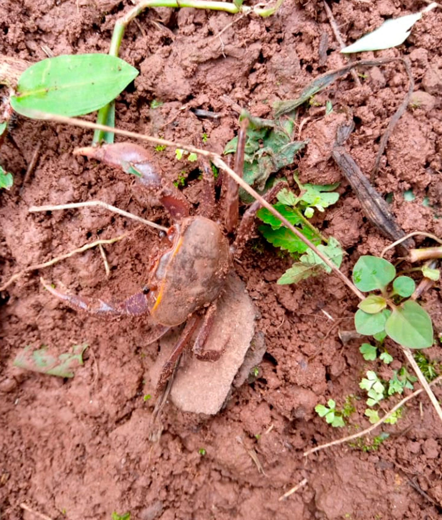 Common Freshwater Crabs (Sudanonuated africanus) were identified in the forest at 10 months, along with yellow caterpillars (Lepidoptera larvae) observed at 12 months. At 24 months, freshwater crabs continue to be observed, along with other burrowing animals.