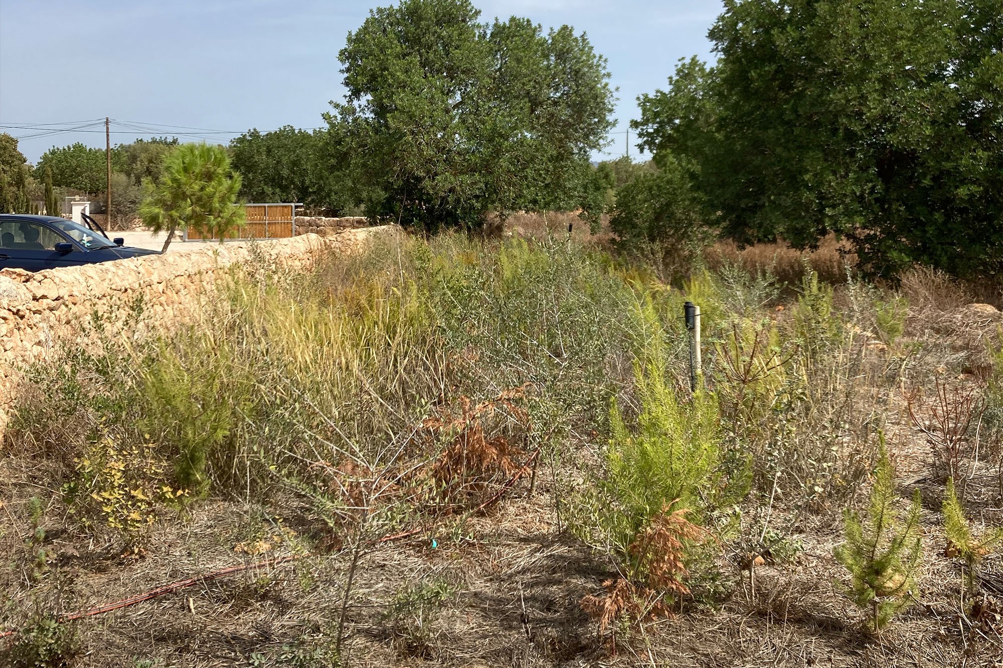 This has been a challenging second year for the forest, though survival rate remains good. Due to the summer heatwave, watering the forest was a challenge, despite the irrigation system we put in. We were relying on trucks for water access and hence the forest was watered less regularly as we would have liked. This has certainly affected the forest though growth is steady, with species like rosemary (Rosmarinus officinalis), Aleppo pine (Pinus halepensis) and wild olive (Olea sylvestris) all doing particularly well.