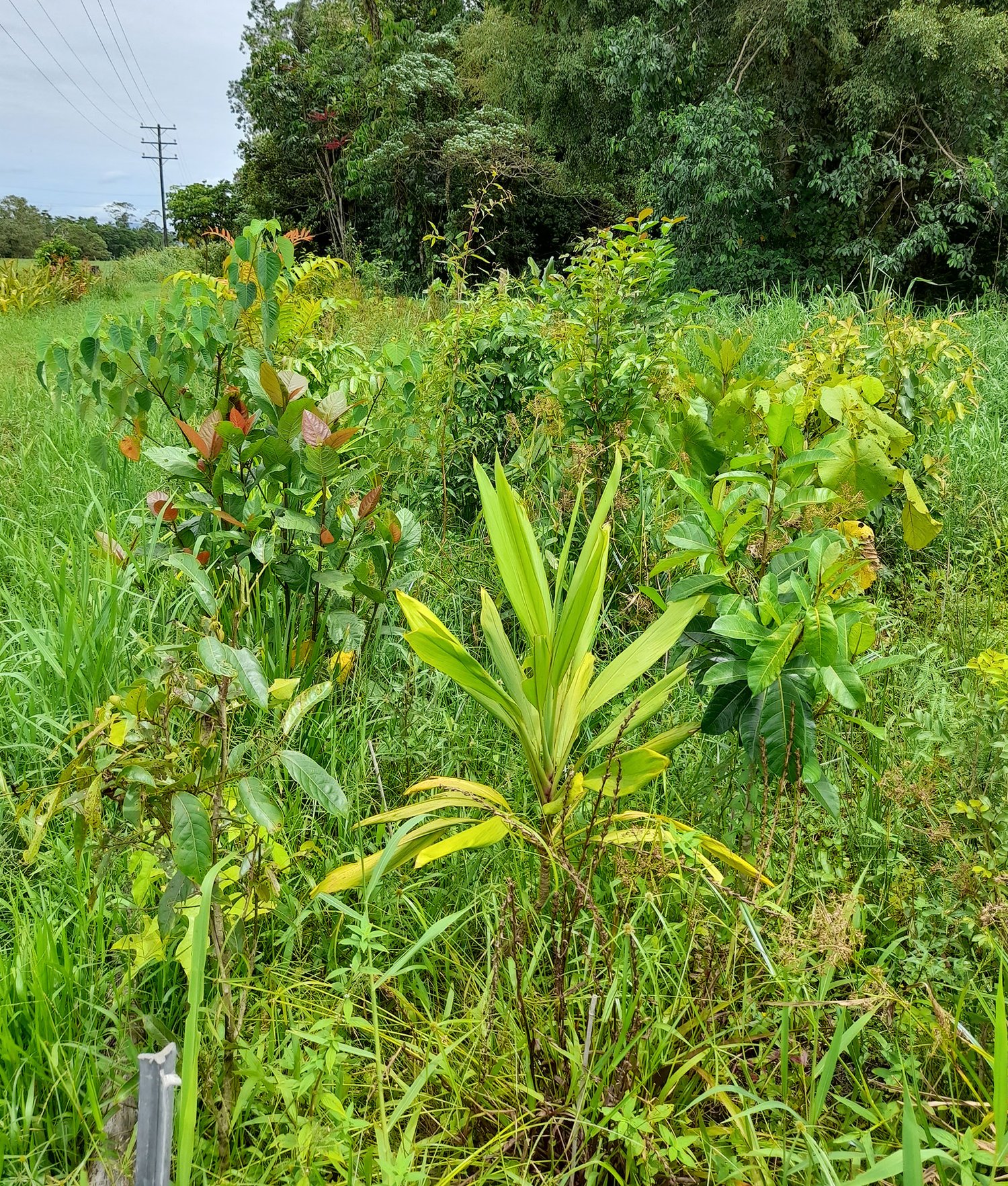 It has been a very wet period! Tully has recorded over 4.7m of rain for the year so far. This is well over 1m more than the long term average. The Miyawaki is proving resilient overall as an ecosystem. Neighbour’s cows have accessed the site again but no damage, hoof prints visible around the edge.
